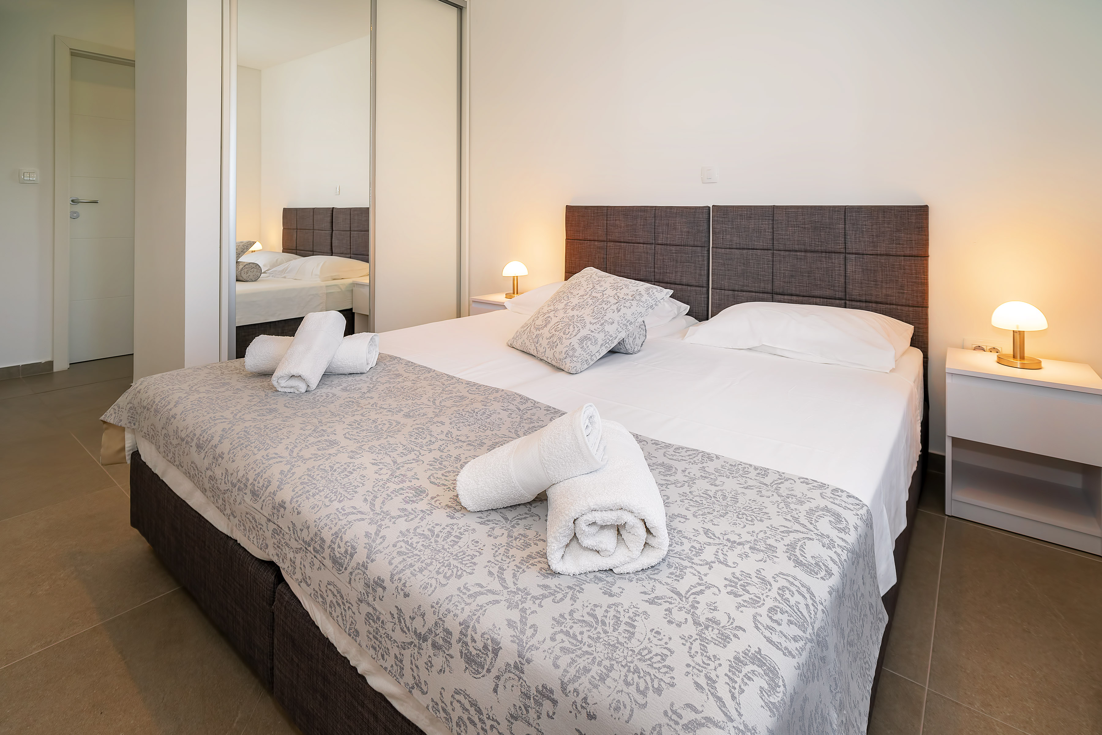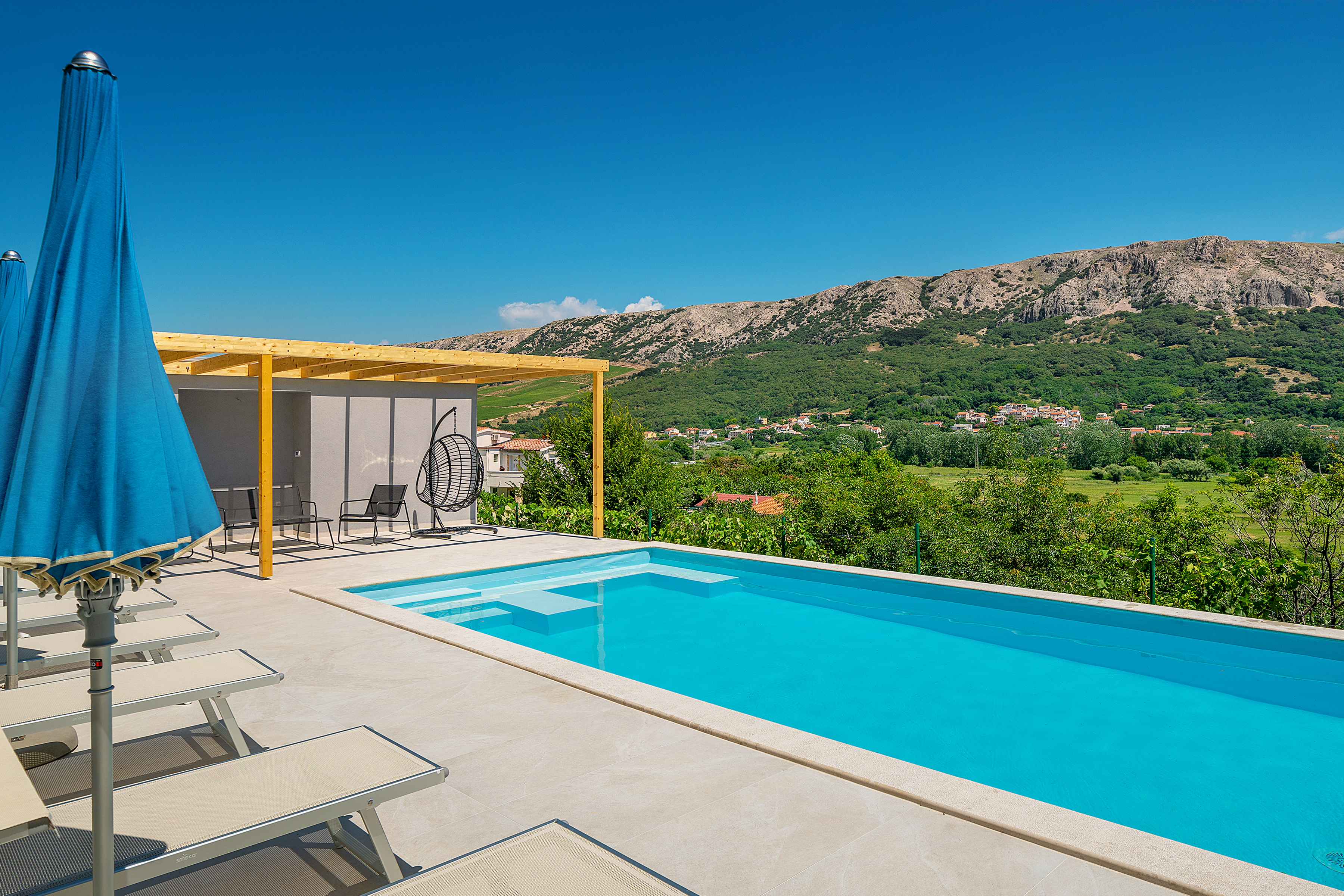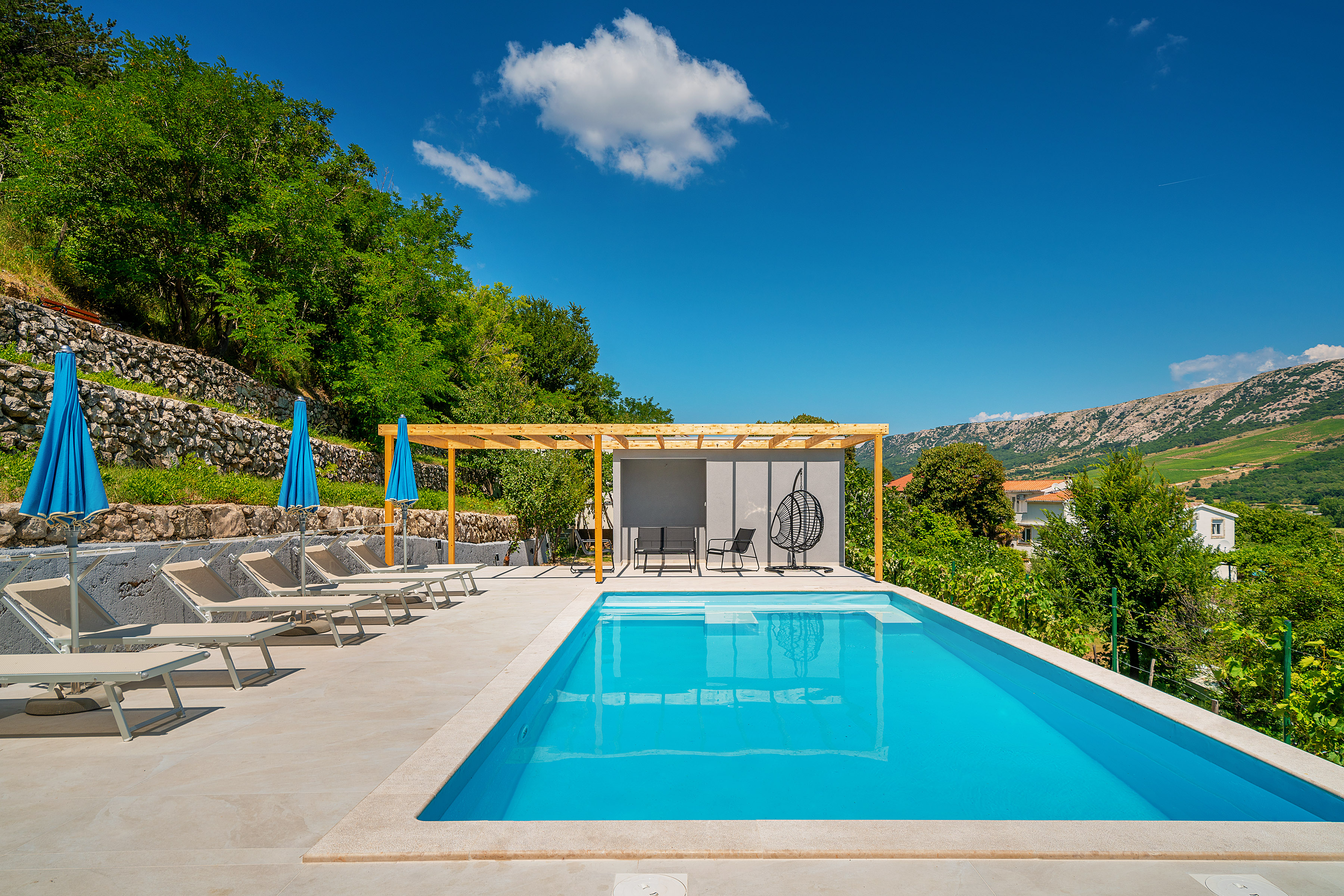 This house consists of a living room with kitchen and dining area, 2 bedrooms with double beds, 2 bathrooms. Our house also has a barbecue area and a beautiful swimming pool with a sunbathing area.