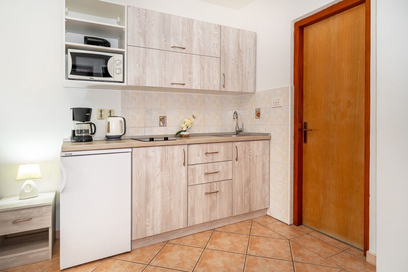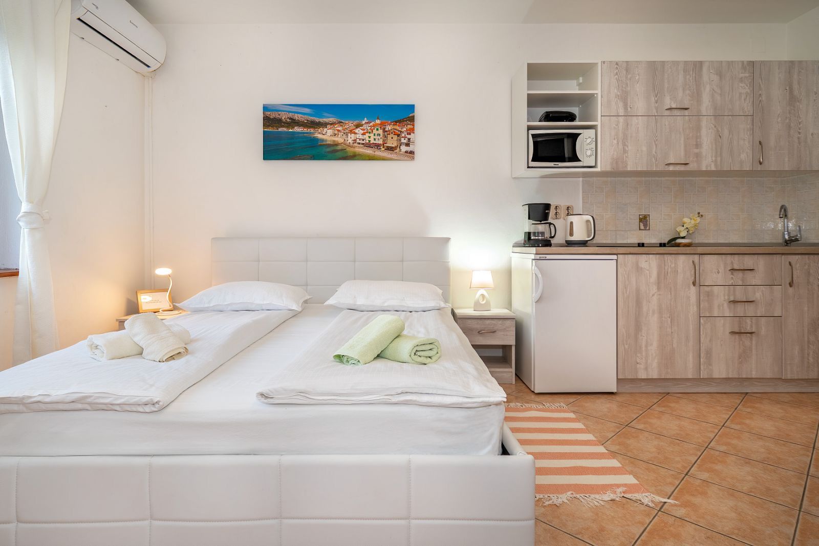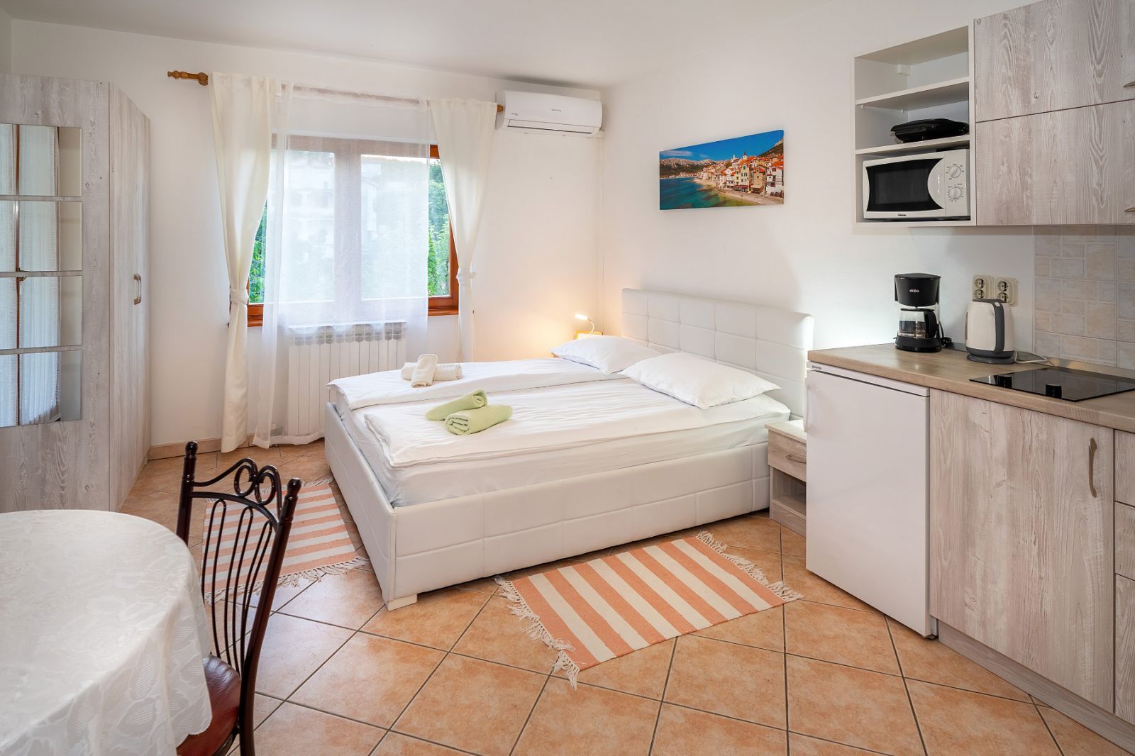 This studio apartment consists of a kitchen with a dining area, a double bed, 1 bathroom, and a balcony. It also has a secured parking space and access to the swimming pool and BBQ garden.